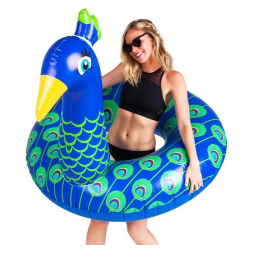 Opvallen in het zwembad? Kies dan deze chille opblaas pauwe ring, ideaal om lekker te drijven en een beetje houvast te hebben.