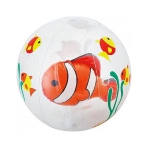 Doorzichtige opblaasbare strandbal met daarin een vis, grappig.